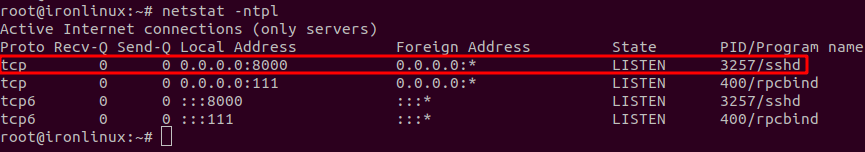 Pronto, mudança realizada e nesse momento seu servidor já passará a ouvir as conexões por esta porta. Abaixo o netstat mostrando o resultado.