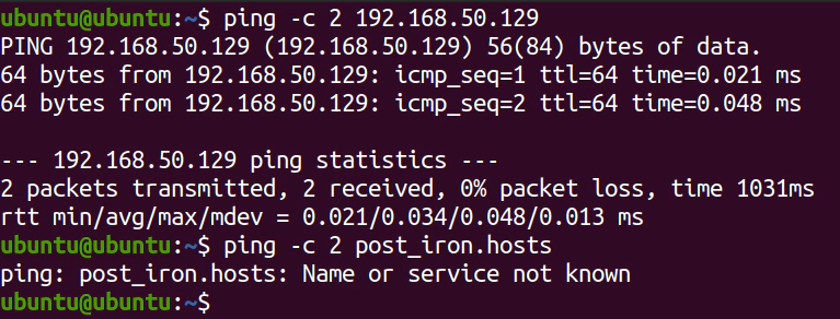 é possível ver que o IP respondia corretamente, ou seja, existia em minha rede, porém o hostname não foi encontrado localmente e nem na internet, pois ele precisou resolver o dns utilizando o server definido no resolv.conf