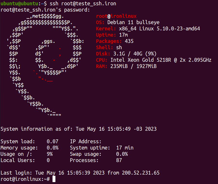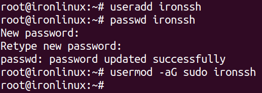 1- Garanta que você possui um usuário que tenha permissão de acesso SSH. Neste tutorial criei o usuário ironssh, alterei a senha dele e adicionei ao grupo sudo:
