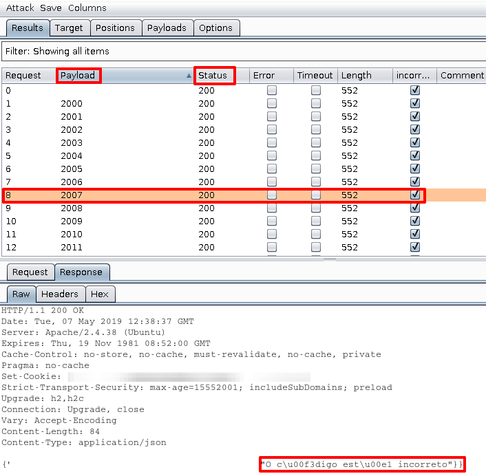 So, after a while, burp sends the correct code to the server and we can see that the response is now different, a confirmation that the code works.