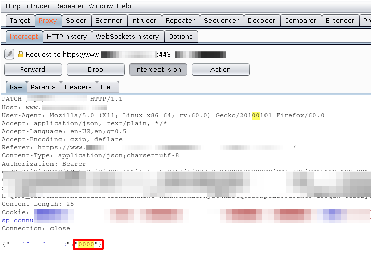 As we can see in the image above, the last line of the request carries the number “0000”, which was the number I typed on the website in order to force it to generate and send the request to the server. The thing is that the request never got to the web server because burp was able to capture it first.
