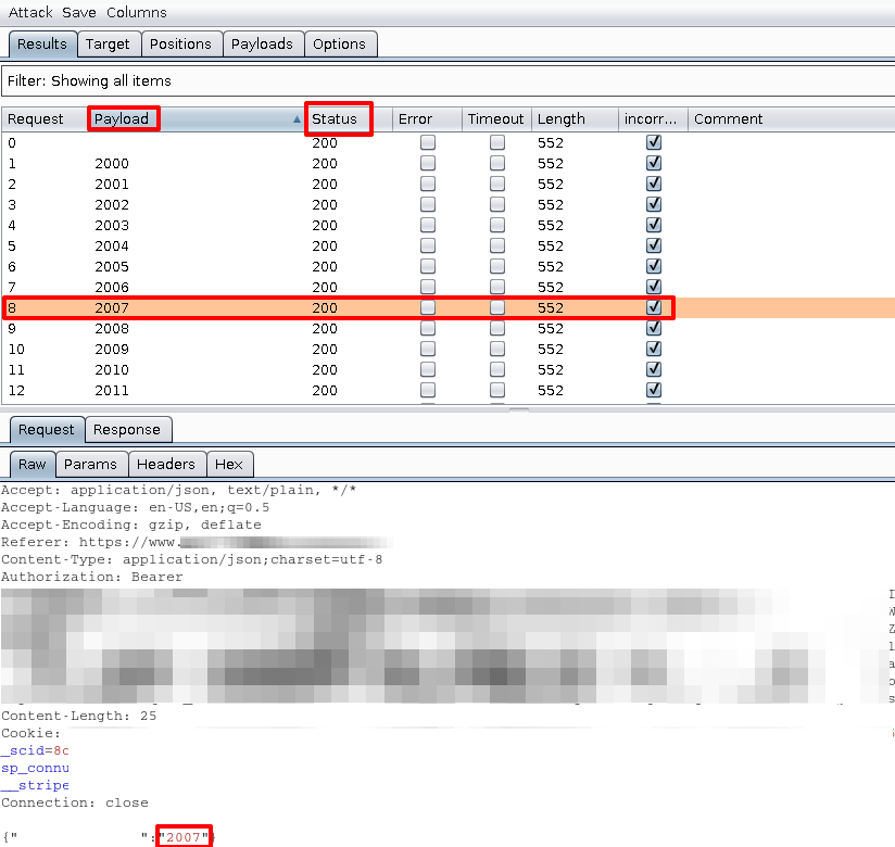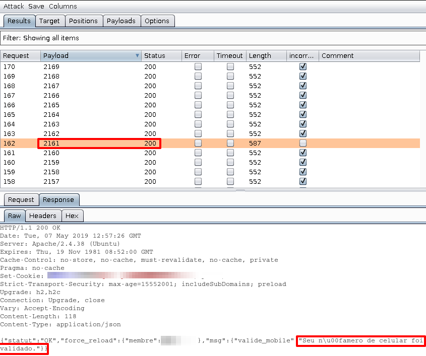 Knowing how the request is formed, now we can make burp send thousands of requests that look just like the original one, but with the difference that the verification code will be unique for each request. The server will receive the packages and process them, looking for the verification codes and comparing them with the correct one. If one code is wrong, the web server answers that request with an error message, and if the code is correct, it validates the phone number.