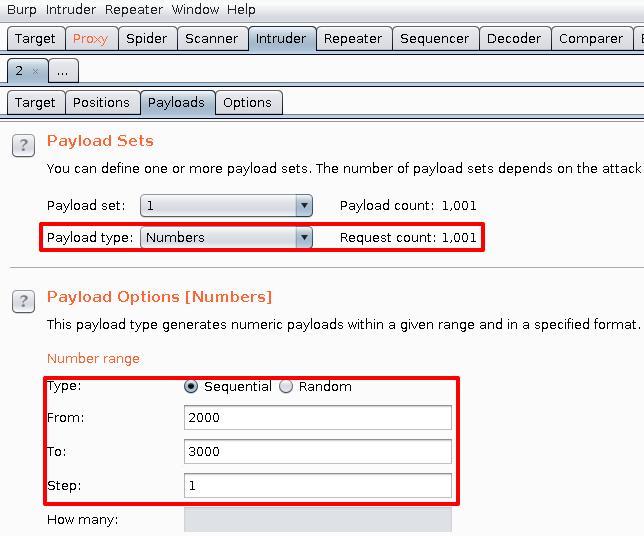 The payload tab of the intruder allows us to generate a list of numbers that will be used in the attack. Each number will be put in a single request, replacing the “0000” from the original one.