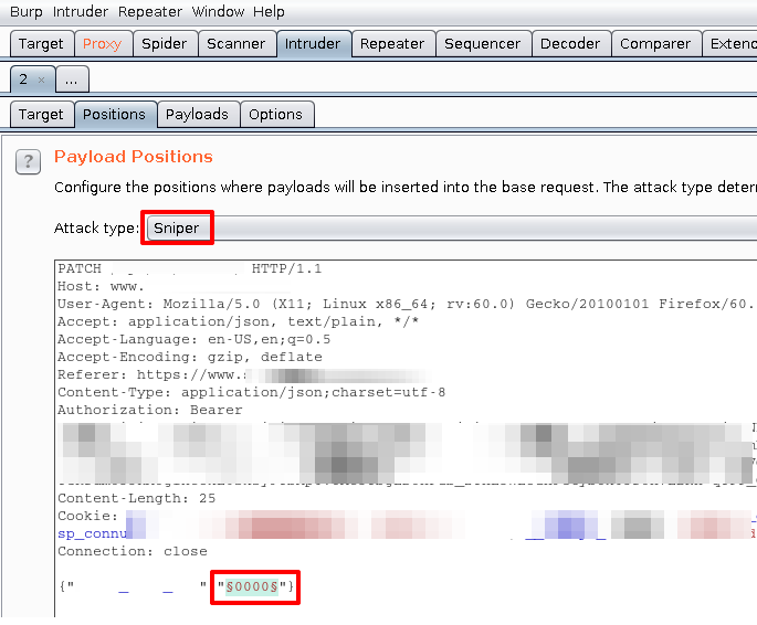 To bruteforce the code, we’ll use the burp’s Intruder tab. It allows us to mark specific parts of the request to be bruteforced. The attack method we’ll use is the Sniper, which is the simplest method.
