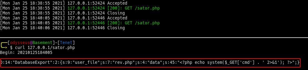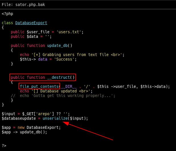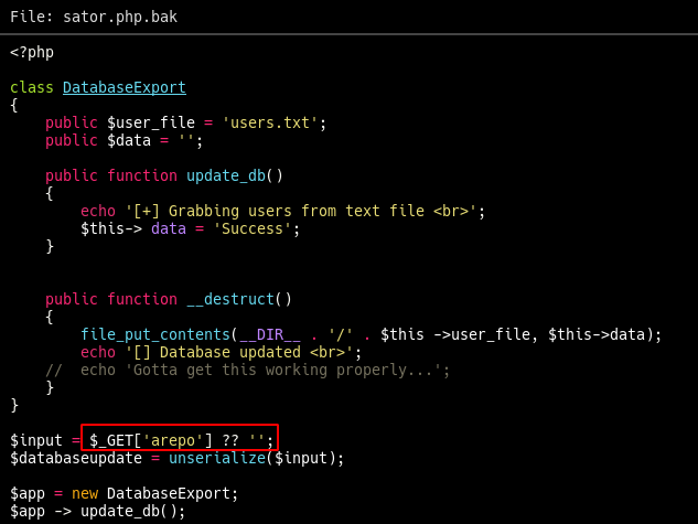 This payload is then sent to the webserver via arepo GET parameter using the original sator.php file: