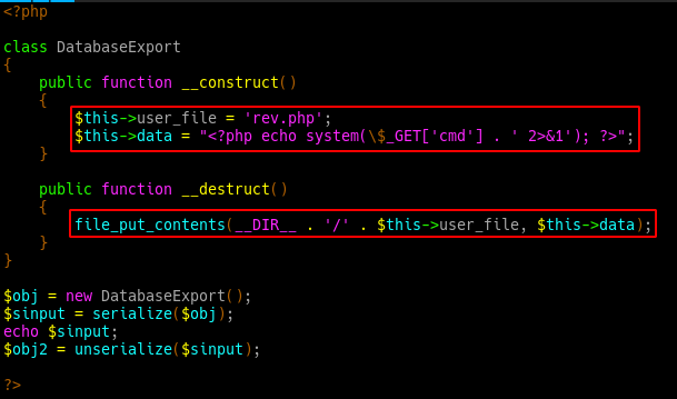 The exploit crafts a similar class that fills the variables $user_file and $data with malicious content: