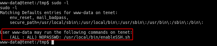 After some basic initial enumeration commands, it was discovered that the user www-data has sudo access and that it can execute the script /usr/local/bin/enableSSH.sh with root permissions:
