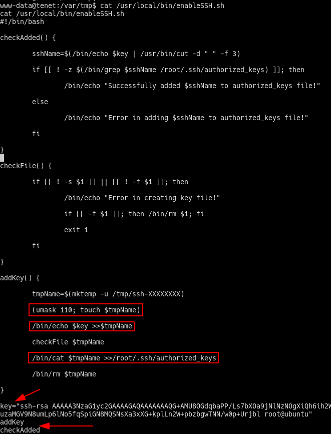 When the script enableSSH.sh is executed, the malicious public key is written into the temporary file and also in the root’s authorized_keys file: