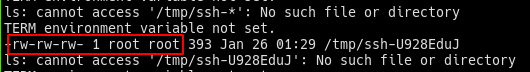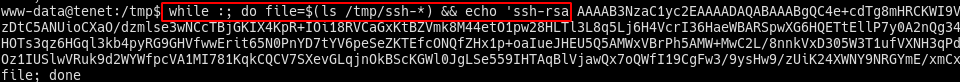The file is created with writing permissions for every user. Because of this, it’s possible to write another public key into the file, so both keys are written into /root/.ssh/authorized_keys. For this to happen, a while loop was written to monitor the creation of a temporary file. When it is created, the malicious public key is written: