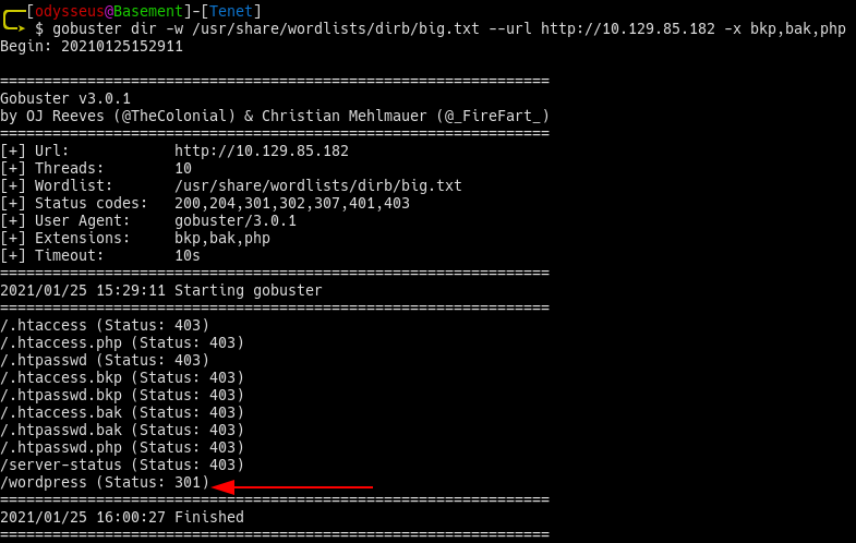 The root of the webserver using the wordlist big.txt led to the discovery of a folder called wordpress.