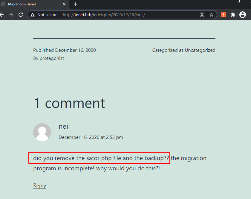 Navigating to the Migration post on the blog, it’s possible to see a comment that leaks sensitive information: