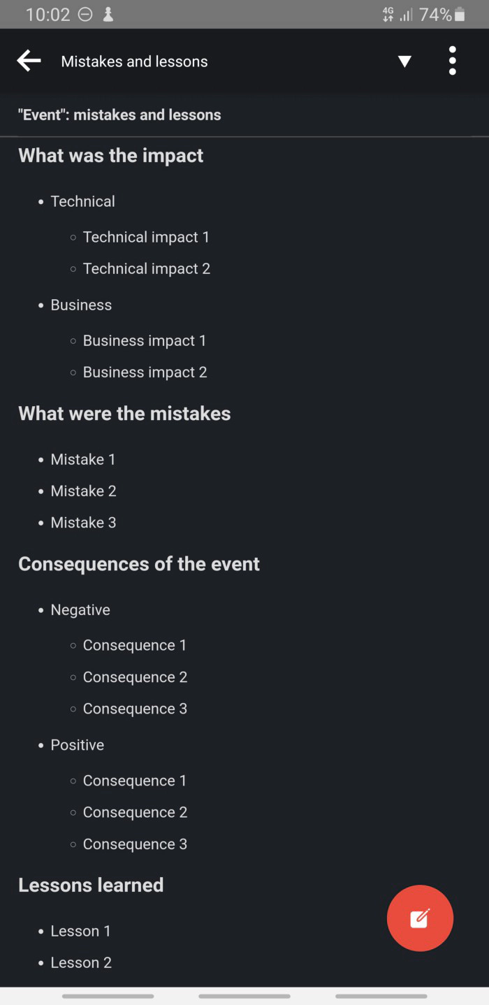 What I recommend for the topics “Action”, “Technical details”, “Impact” and “Consequences” is that you gather as much information as possible, so you have them rich in details. This will help to remember the event in the future. Also, involve the team in the process. They can help you to grow the details and even add more information.