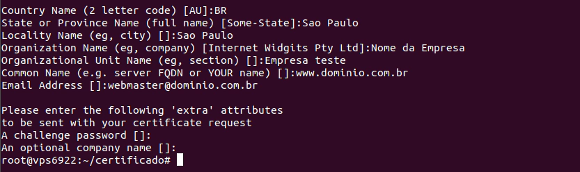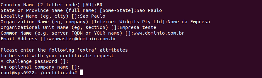 Ao executar os comandos acima deverá preencher as informações do certificado que esta gerando. No print abaixo segue um exemplo de como deve ser preenchido: