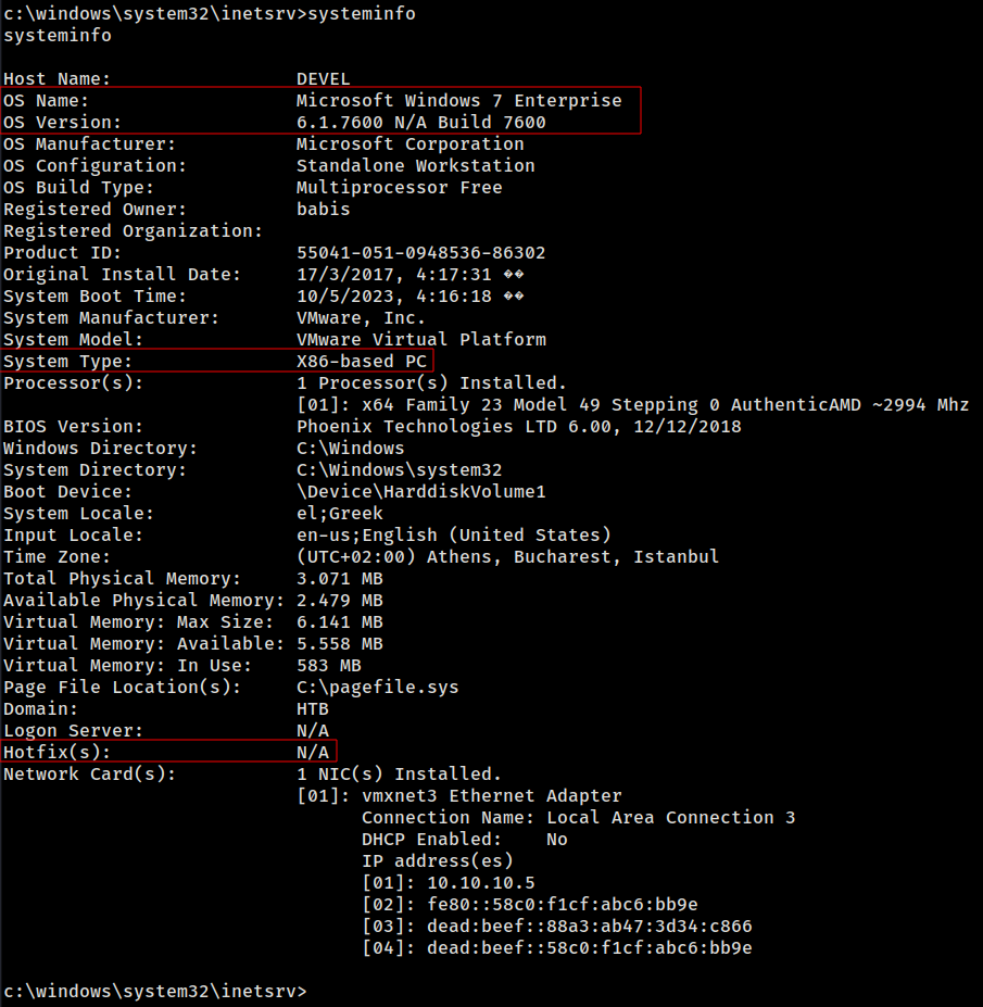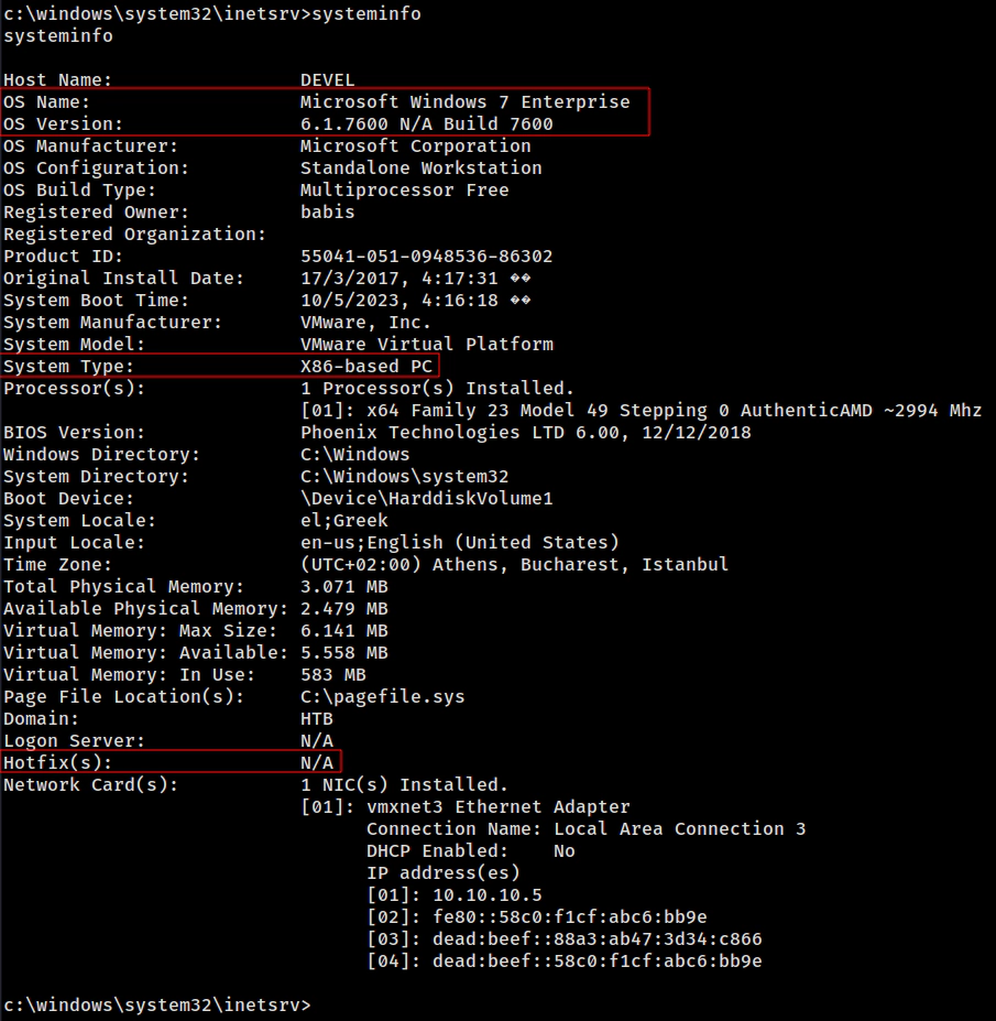 Com este comando, é possível observar que o SeImpersonatePrivilege está ativo na máquina. Ademais, verificamos que a arquitetura do sistema operacional é de 32 bits (x86).