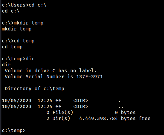 Na máquina alvo, na sessão que obtivemos anteriormente, é necessário criar uma pasta na qual tenhamos permissões de escrita. Dessa forma, seremos capazes de criar ou fazer upload de arquivos.