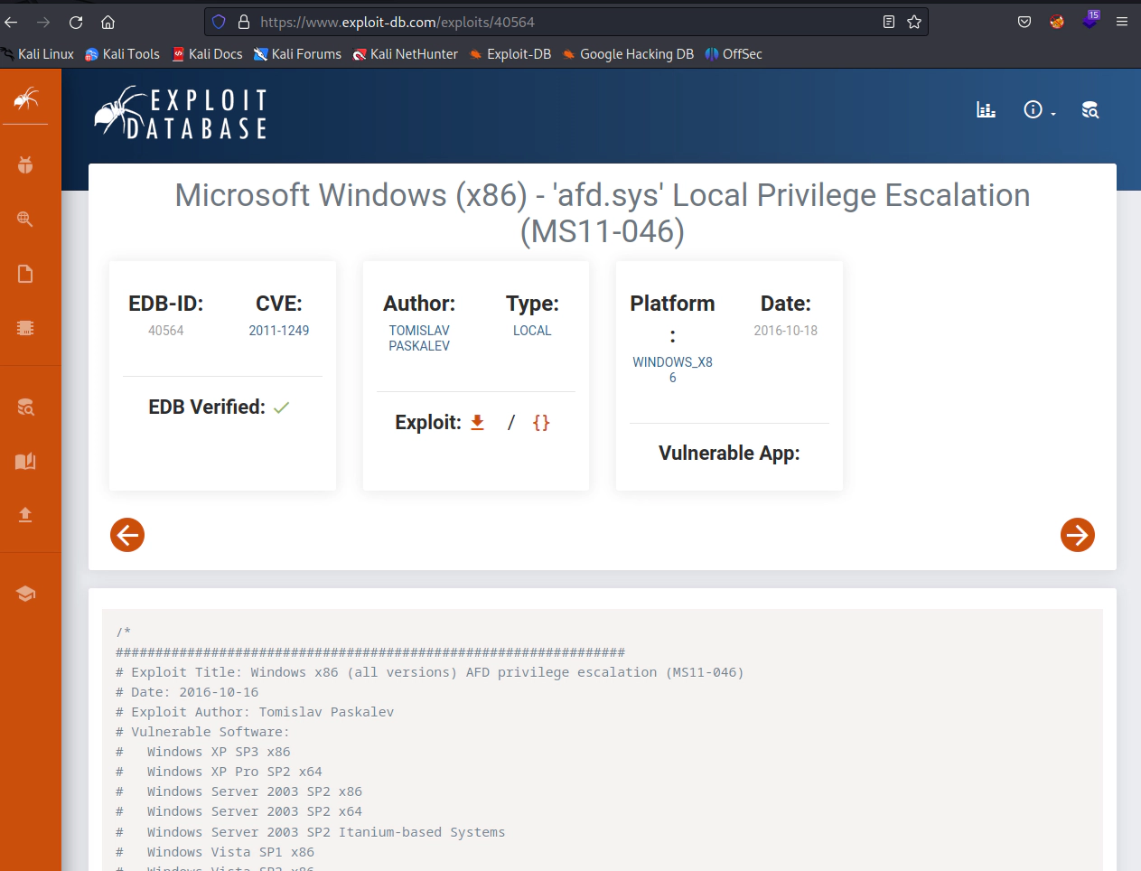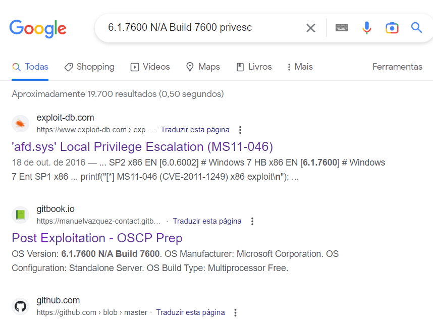 Após pesquisar na Internet por 6.1.7600 N/A Build 7600 privesc, encontramos o seguinte link: https://www.exploit-db.com/exploits/40564 .