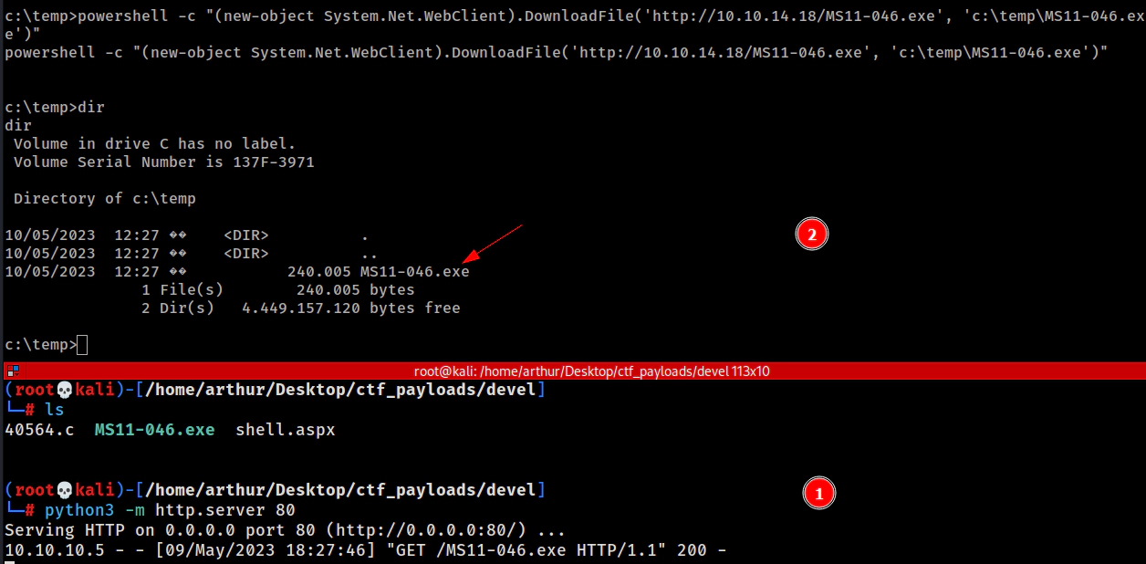 Com o arquivo MS11-046.exe compilado, precisamos enviá-lo para a máquina alvo. Para fazer isso, podemos usar o Python em nossa máquina atacante para hospedar um serviço da web a partir do diretório atual. Para isso, podemos utilizar o seguinte comando: