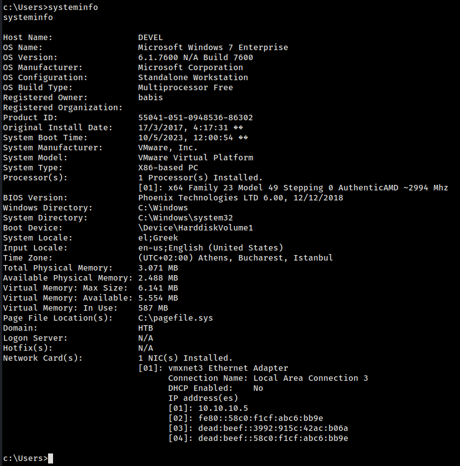 Com a saída que obtivemos, é possível verificar que a máquina está utilizando o sistema operacional Microsoft Windows 7 Enterprise. Além disso, a linha de versão do sistema é 6.1.7600 N/A Build 7600.