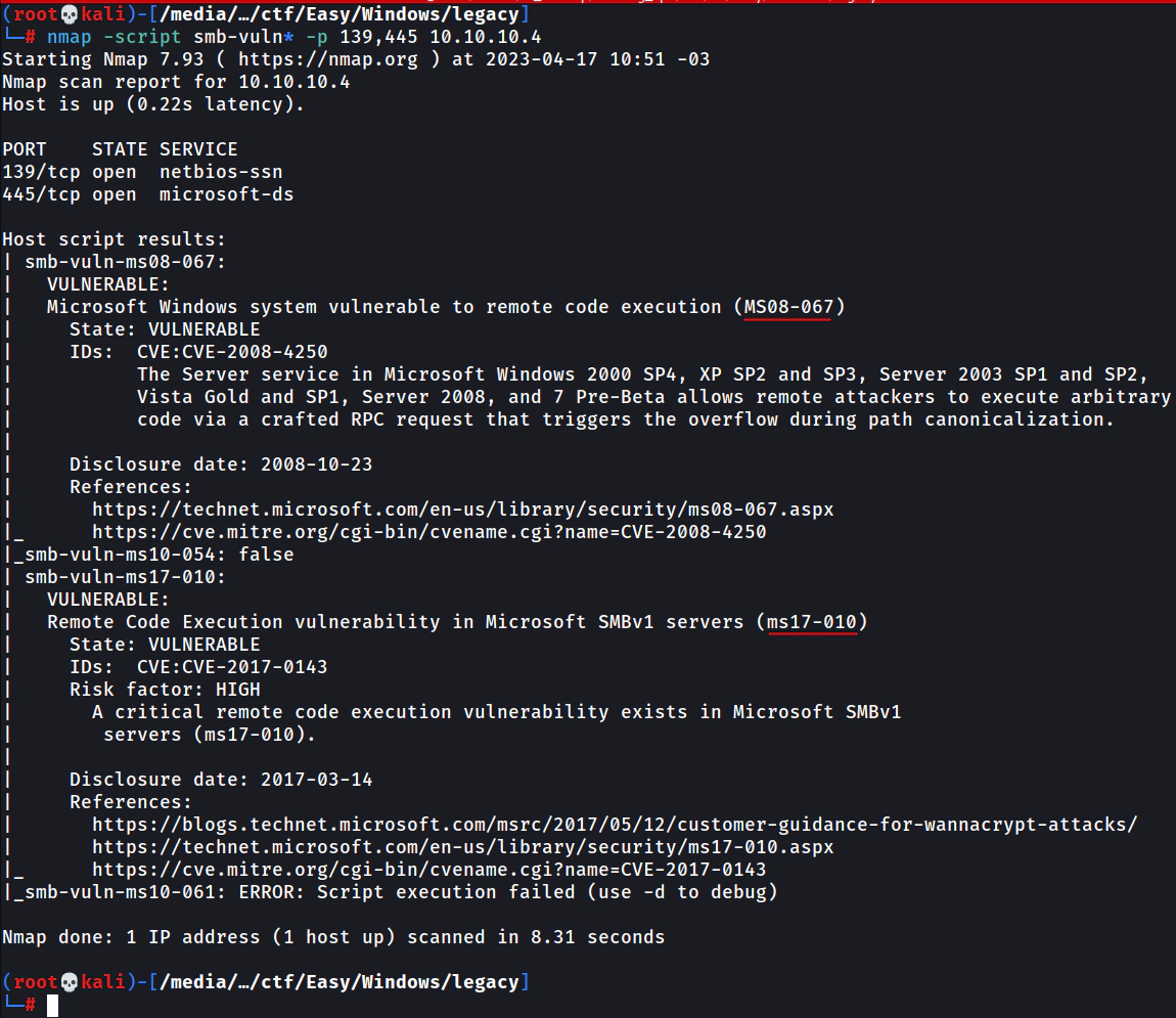 nmap -script smb-vuln* -p 139,445 10.10.10.4