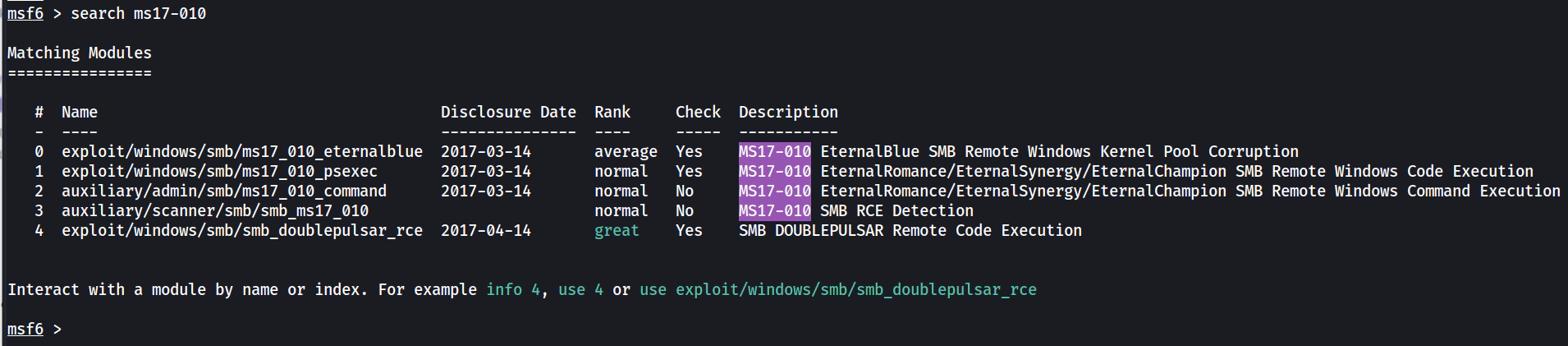 use exploit/windows/smb/ms17_010_psexec