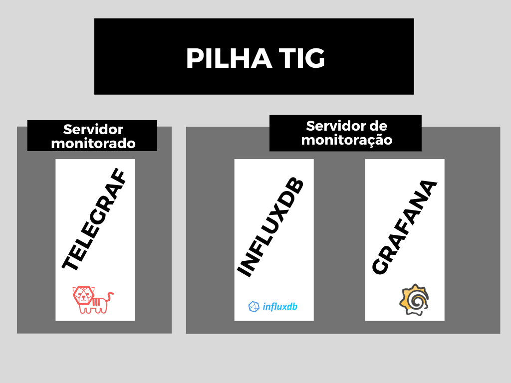 Temos SEMPRE no servidor monitorado o agente do Telegraf para que possa colher e enviar as métricas para o banco de dados InfluxDB e no servidor de monitoração teremos o influxdb e o grafana, podendo ou não ficar no mesmo servidor. Caso tenha dúvidas de como montar de acordo com sua estrutura, podem comentar neste post ou nos enviar um e-mail. No decorrer dest post você entenderá melhor como funciona o agente, banco e dashboard.