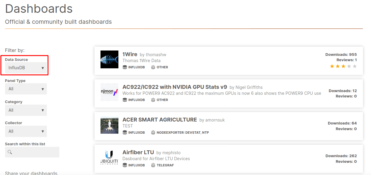 2- Acesse https://grafana.com/grafana/dashboards/ e escolha um dashboard compatível com InfluxDB