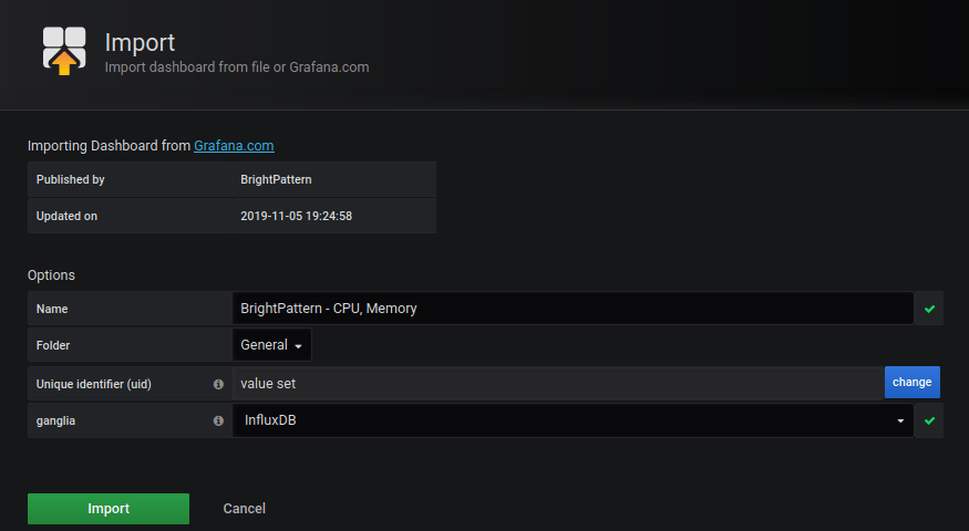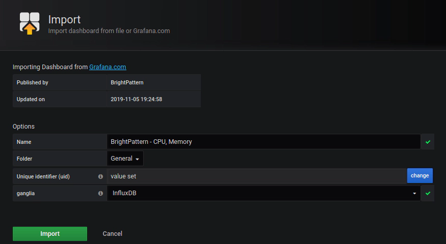 5- Ao colocar o ID e clicar em LOAD a tela abaixo será exibida. Essa tela conterá o nome do dashboard importado, onde será salvo e etc. Esses valores são customizáveis e você pode colocar como achar melhor