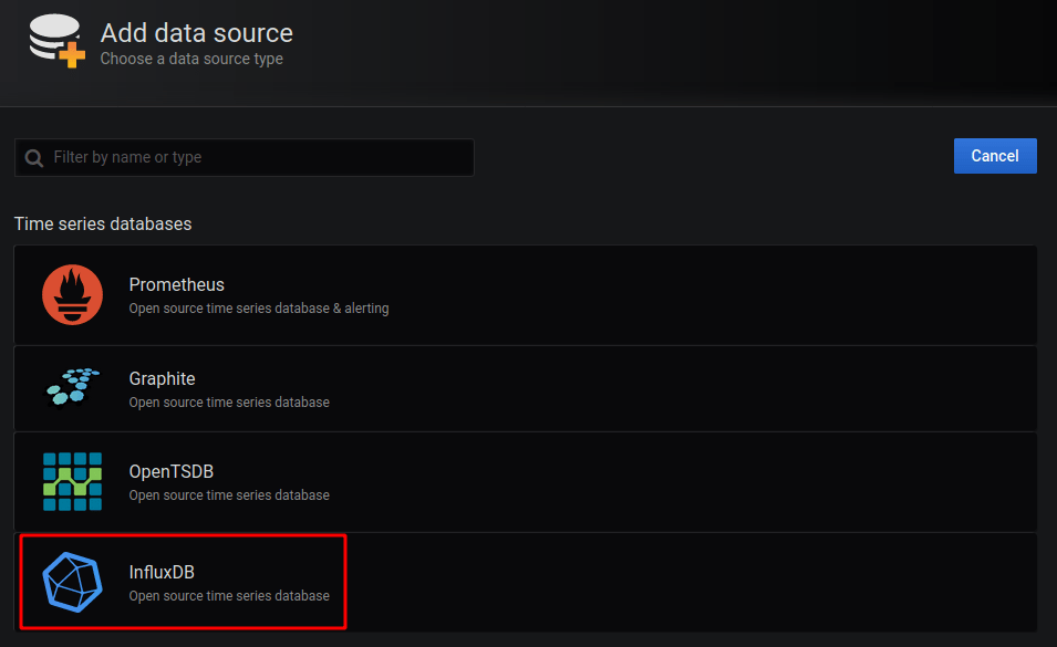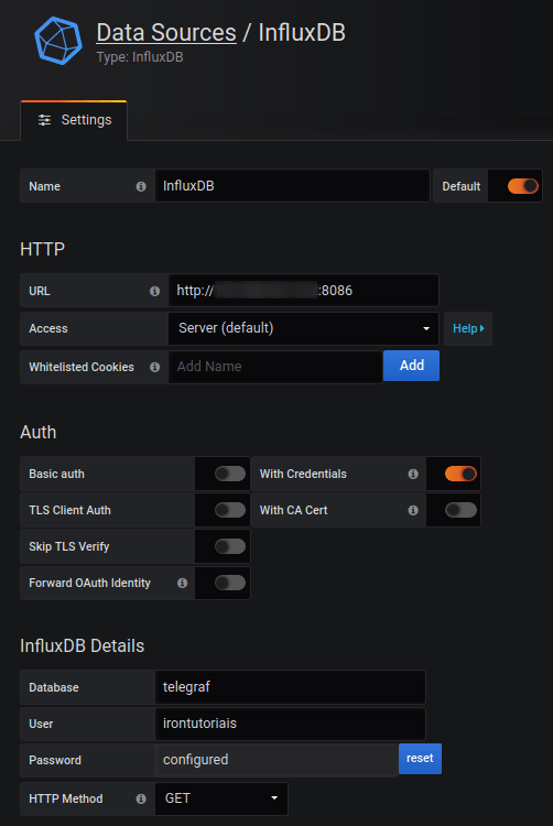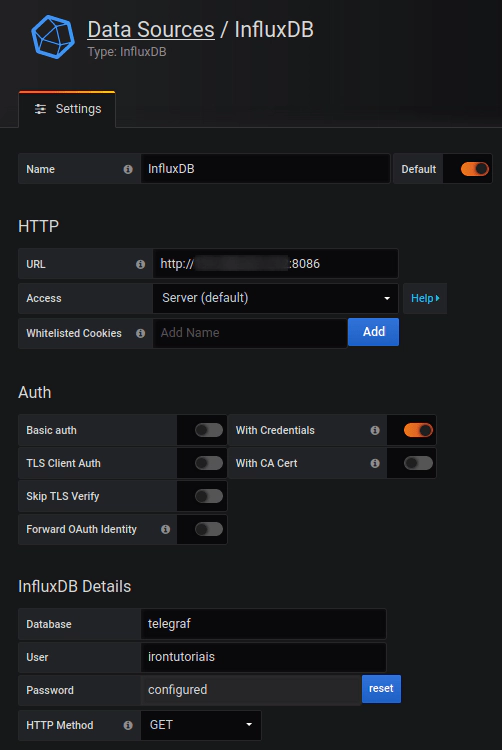 url: preencha os dados do seu servidor com a porta do influx 8086. Ex: localhost:8086 / seudominio.com.br:8086 / ip-do-seu-server:8086