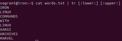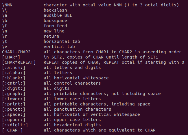 Além de manipular letras, palavras e etc, é possível também trocar por símbolos, com o tr -help você vê as opções disponíveis: